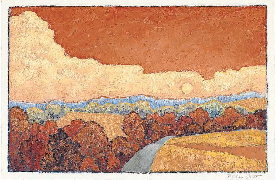 The current show at the Square Pear Fine Art Gallery in Kennett Square looks at the landscape and nature in several mediums, beginning with the appropriately russet and gold autumn paintings by Barbara Grant. Her “Around the Bend,” a richly textured view of a white roadway curving through trees, has a splendid depth and lovely shadows. Grant’s “40 Acres” has warm-toned leaves interlocking over dark trunks in a woodland.
