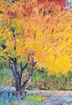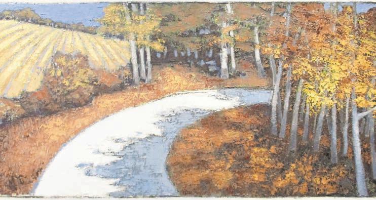 Lidia Kohutiak shows autumn-colored oils of rocks and woodlands, and her “The Brook” has a beautiful reflection of fall leaves in the still water.