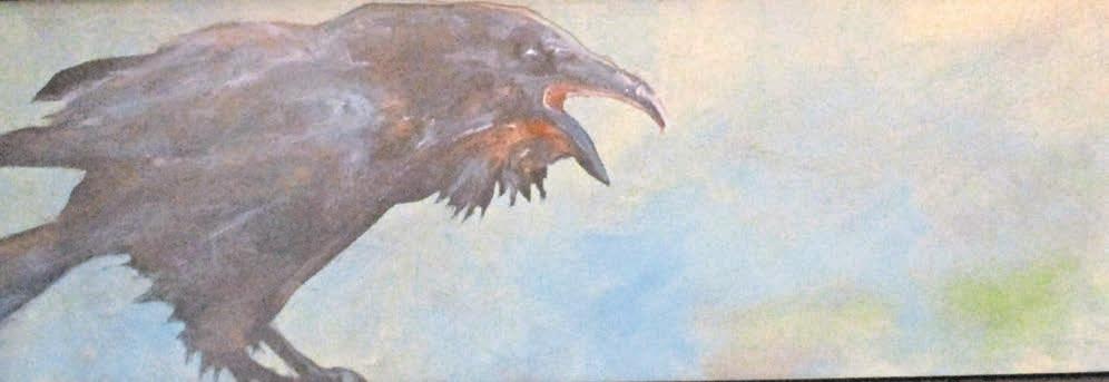 “Catch Me If You Can” has a wily sort-of bird and a man with a net, and both “Winter Flight” and “Coasting” show rounded birds in various landscapes. “The Real Reason Phoebe Flew Away” is a very detailed arrangement of figures, a bird and overlapped patterns that make up what could be a scene from some dark opera.