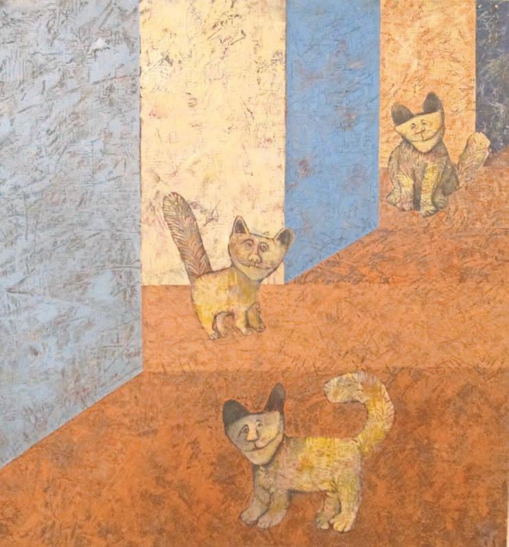 In “The Pessimist,” whatever sort of creature it is ponders a grumpy mood amidst the flowers. There’s a beguiling goat gazing out at you in “Moonstruck” and “Goatie in Woods,” and Fred, a rather human-faced cat, grins at you in several other works.