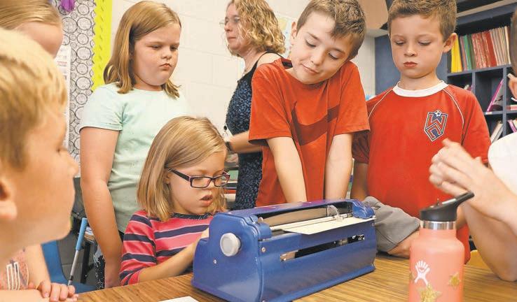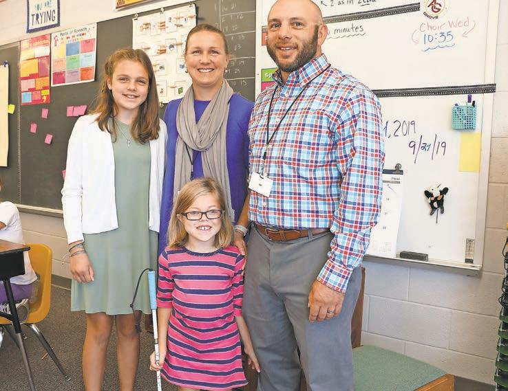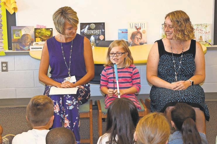 mobility teacher, Jennifer Bennethum, who helped her facilitate a question and answer session with her classmates. Perkins told her fellow fourth grade students about her vision impairment and described how she functions with limited vision. She explained that her glasses are fake but she wears them to protect her eyes. She demonstrated how she uses a cane, not a stick, to help her navigate her surroundings. Students were encouraged to ask questions and Perkins was quite comfortable and confident answering them. According to her mother, Lynne Perkins, “When Corinne presents to her peers each year, it empowers her.” Perkins plans to continue educating not only her peers but also the greater community about braille.
