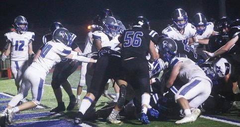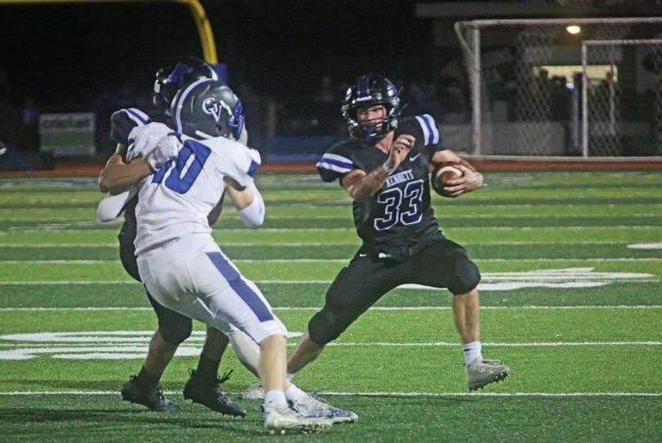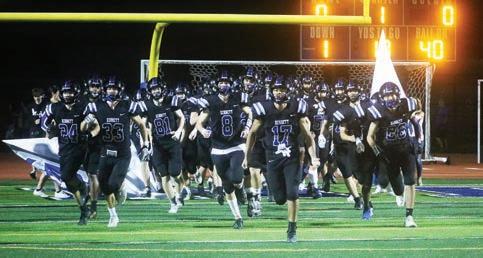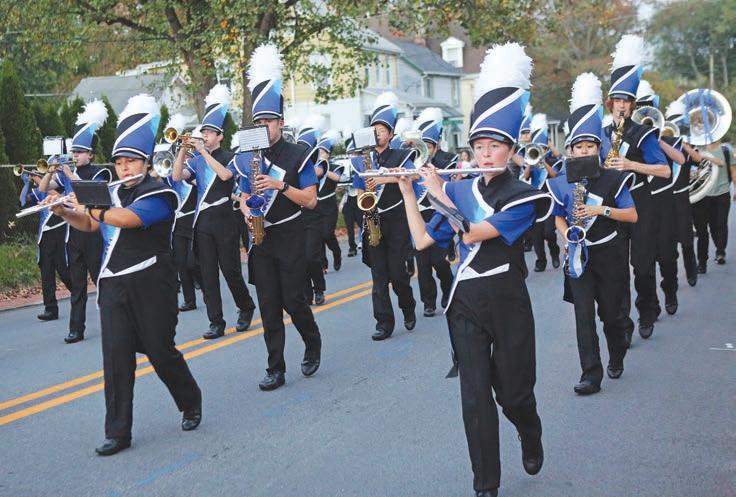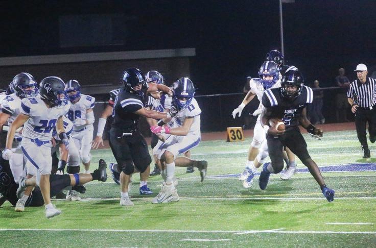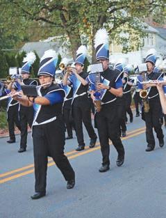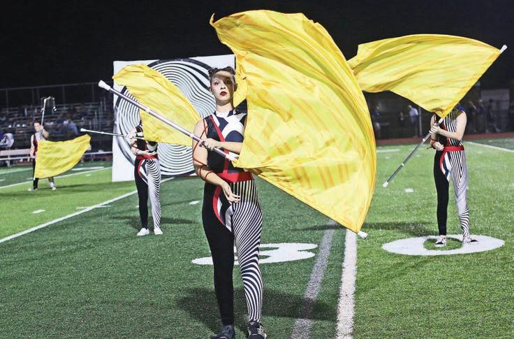 Kennett’s Kalen Frazier avoids the crowd in his carry down the field.The band front flag team performs at halftime.