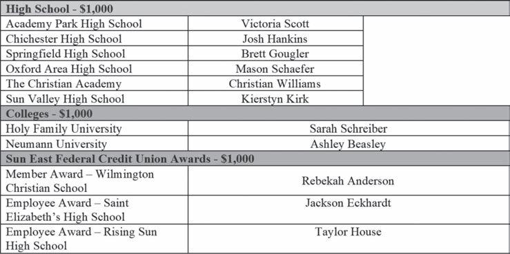 Sun East’s student and teacher awards were designed to include area schools and universities who are credit union members. To date Sun East has awarded approximately $270,000 in student and teacher recognition over the past 18 years. For more information or to apply for future Sun East awards, visit www.suneast.org/site/ about_scholarship.php.