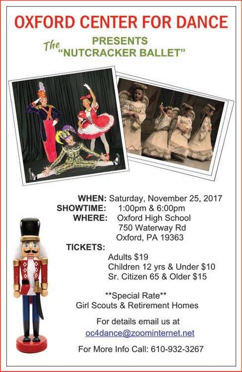 Christmas with the Oxford Trio and Friends, featuring the Oxford Trio and guest singers from the Oxford Area School District’s Hopewell School, will be held Dec. 1 at the Oxford Methodist Church (Market and Addison streets, Oxford). There will be choral and instrumental offerings, carol singing, and a few surprises. The concert will begin at 7:30 p.m. Admission is free, but an offering will be accepted. Call 610-509-3267 for more information.