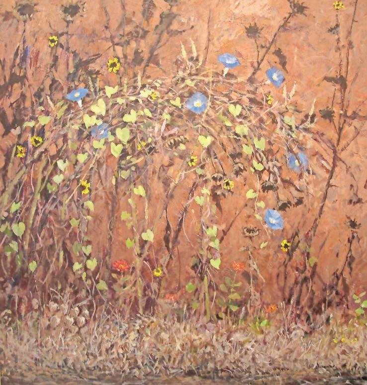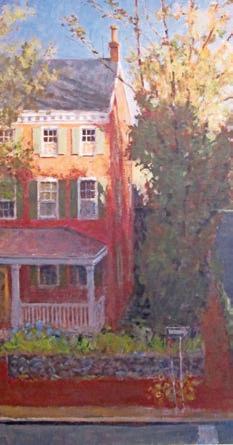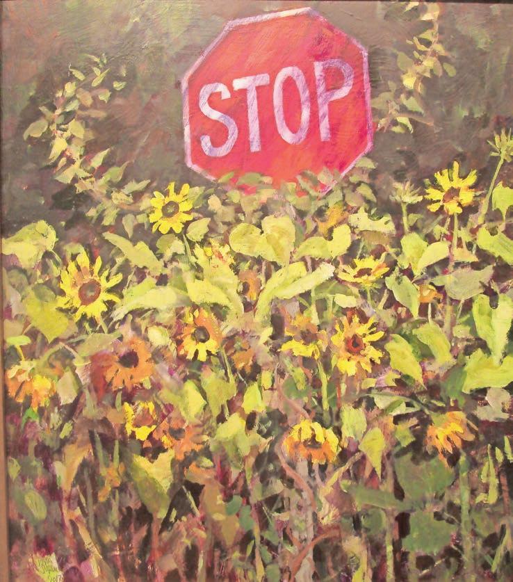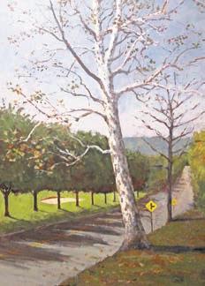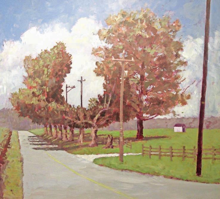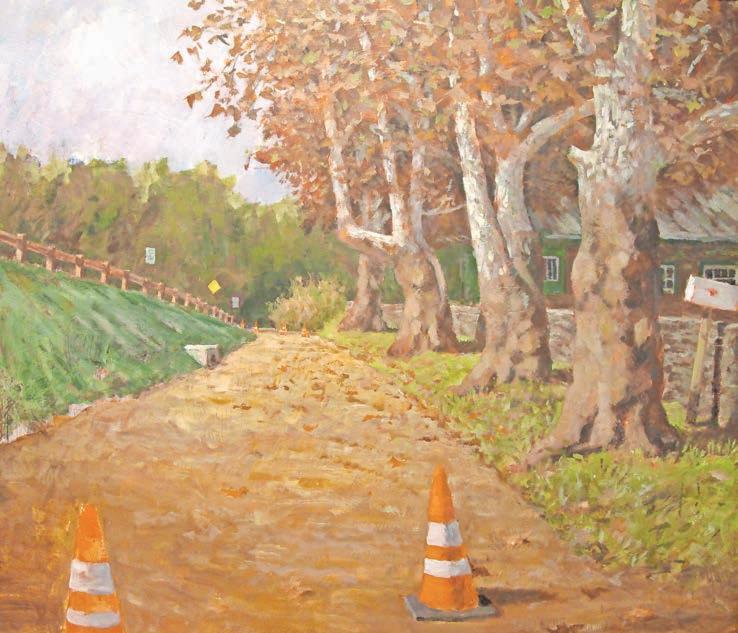 Suplee’s love of flowers is seen in “Cheerful Disregard,” in which exuberant sunflowers try to overwhelm a stop sign. Flowers also take a final bow, with only a few scattered colorful blooms amidst the dried stalks in “November Flowers.” “Last of the Line” is a view of North High Street, heading out of West Chester, where a solitary living sycamore stands as a sentinel for what used to be a stately line of trees.