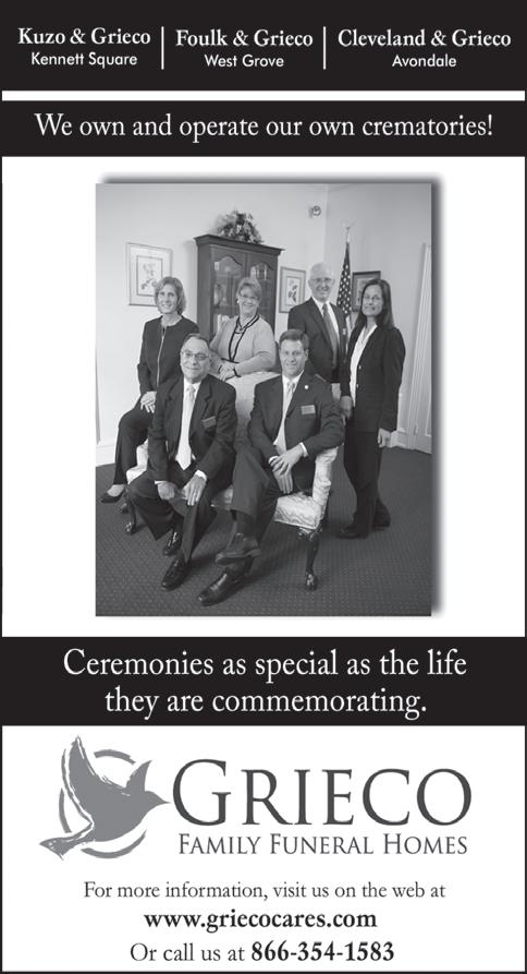 A funeral was held Dec. 9. Interment was in Union Hill Cemetery. Contributions in her memory may be made to Kennett Square Missionary Baptist Church, 408 Bayard Rd., Kennett Square PA 19348. To view her online tribute and to share a memory with her family, visit www. griecocares.com.