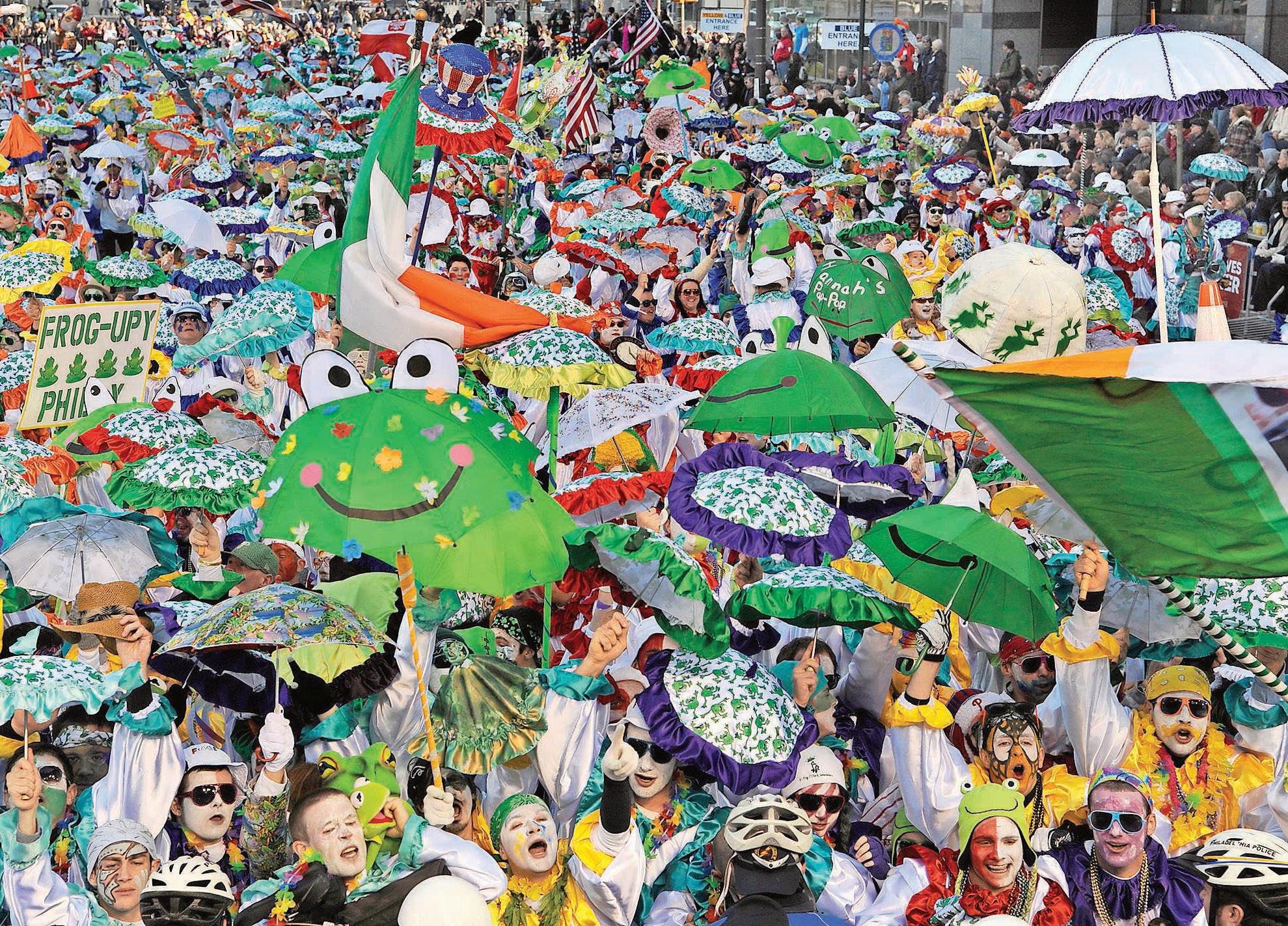 The parade will include five divisions, each with its own artistry, sound and customs. Starting at 9 a.m., leading the parade is Golden Sunrise Fancy Club, which is the last remaining Fancy club in the Philadelphia Mummers Association. Next, at approximately 9:30 a.m., will be the men of the Wench brigades, clad in bonnets and bloomers, and waving multi-tiered parasols. Then at about 10:30 a.m., it’s the Comics, who often parody current political issues and pop culture.