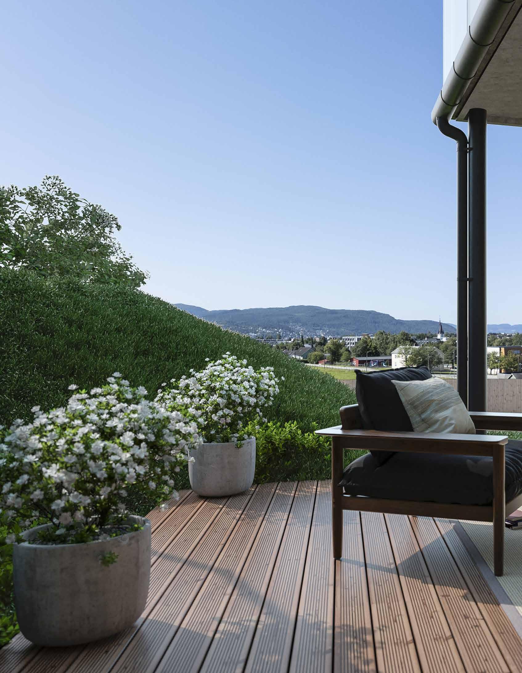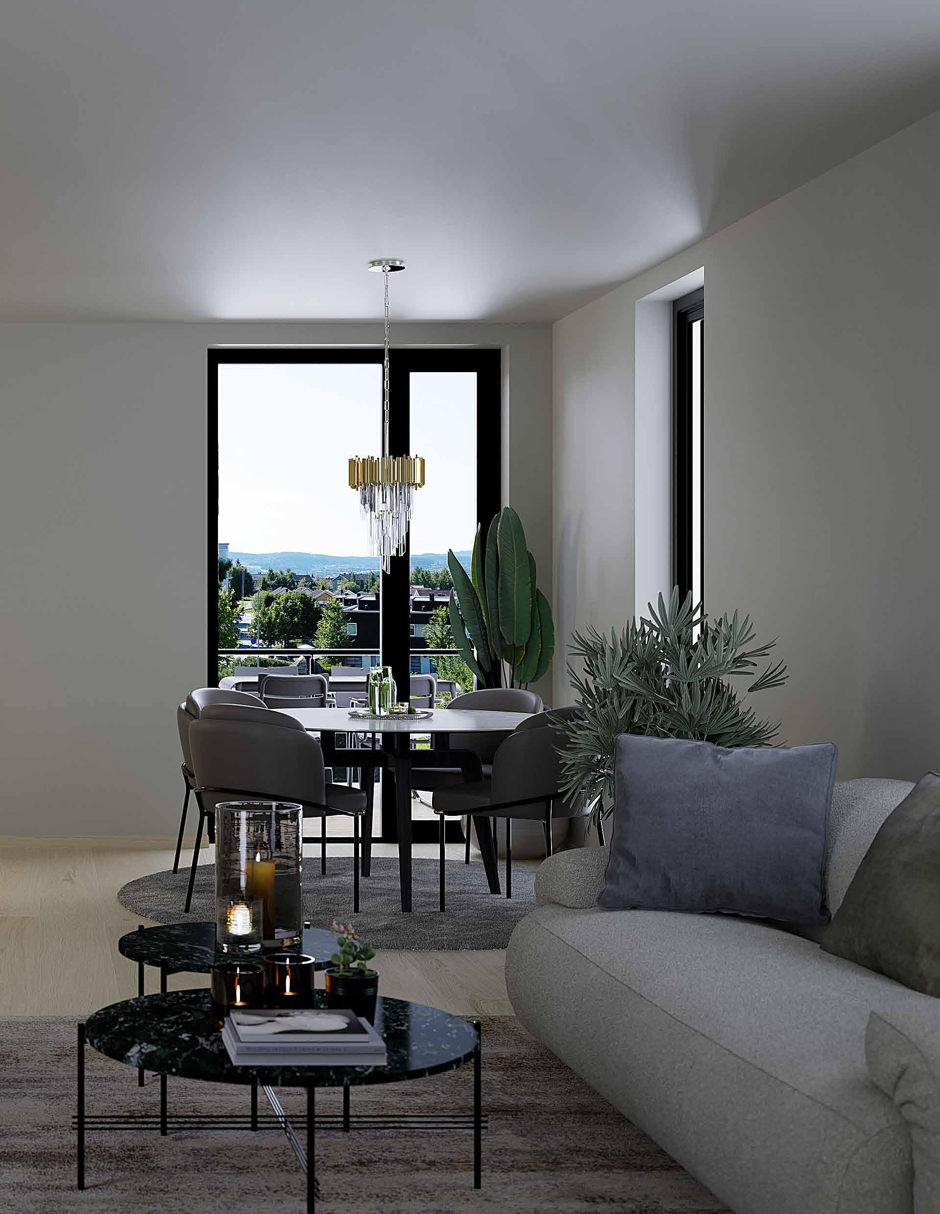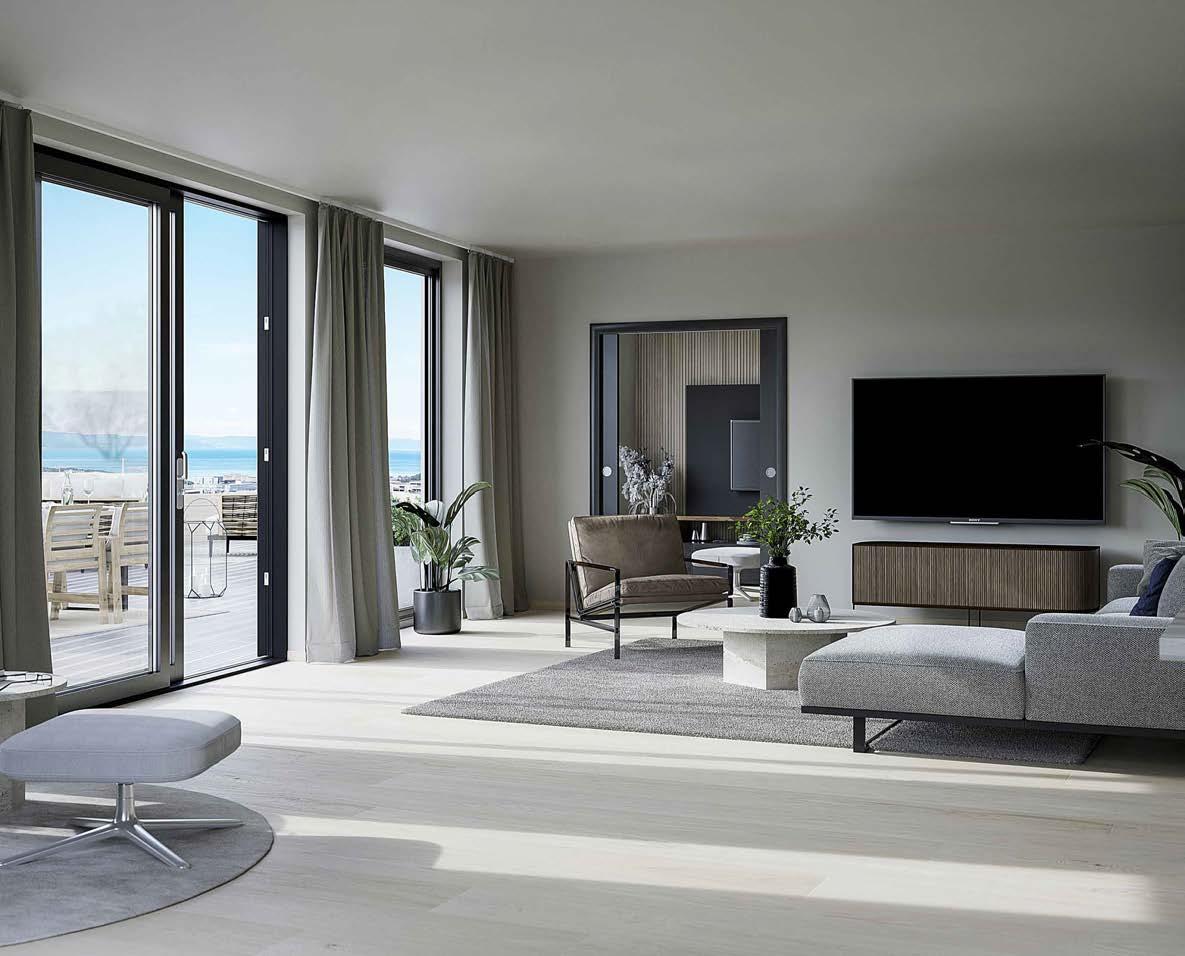 Også fra nederste etasje får du fantastisk utsikt! Dette er en visualisering fra leilighet H0001