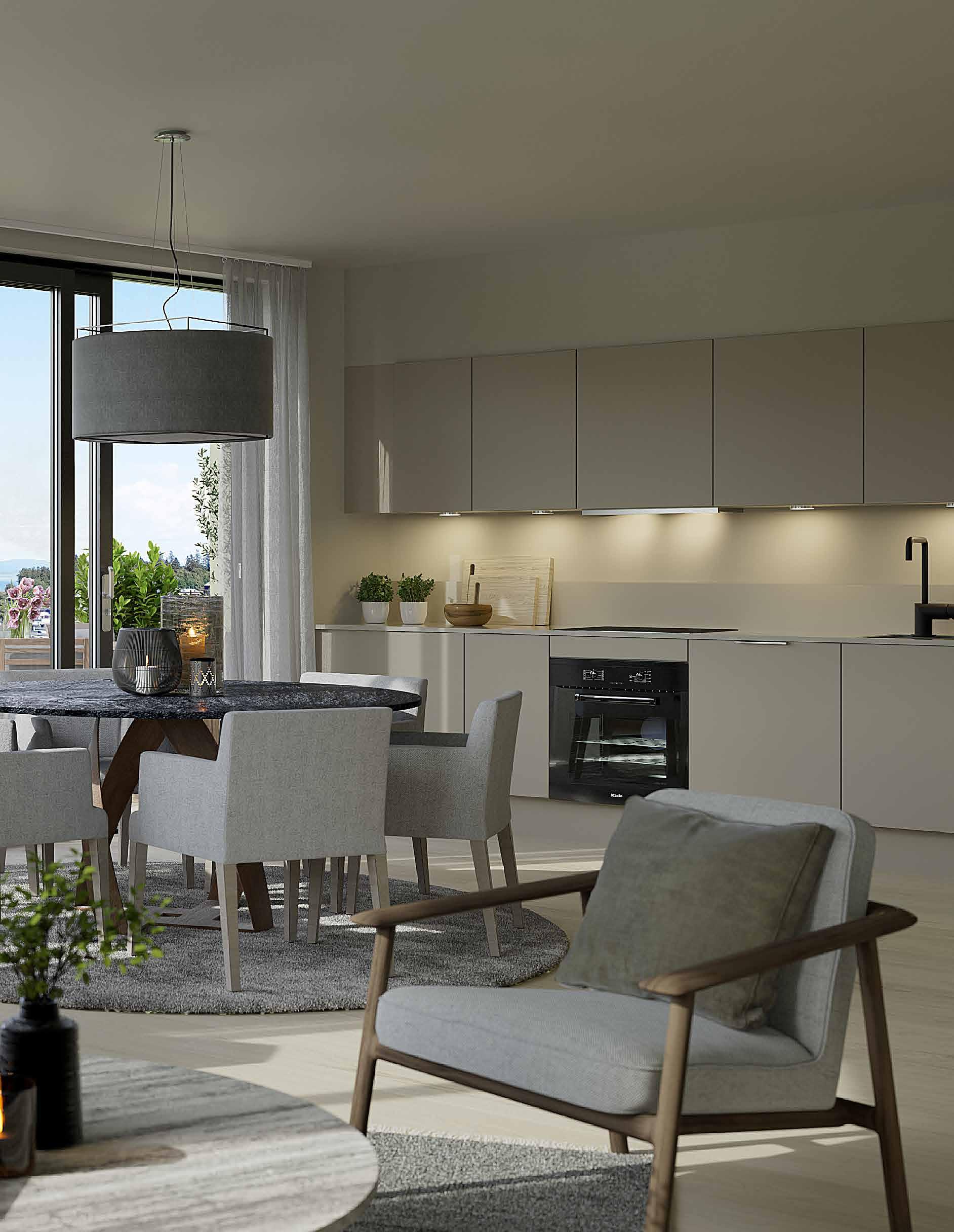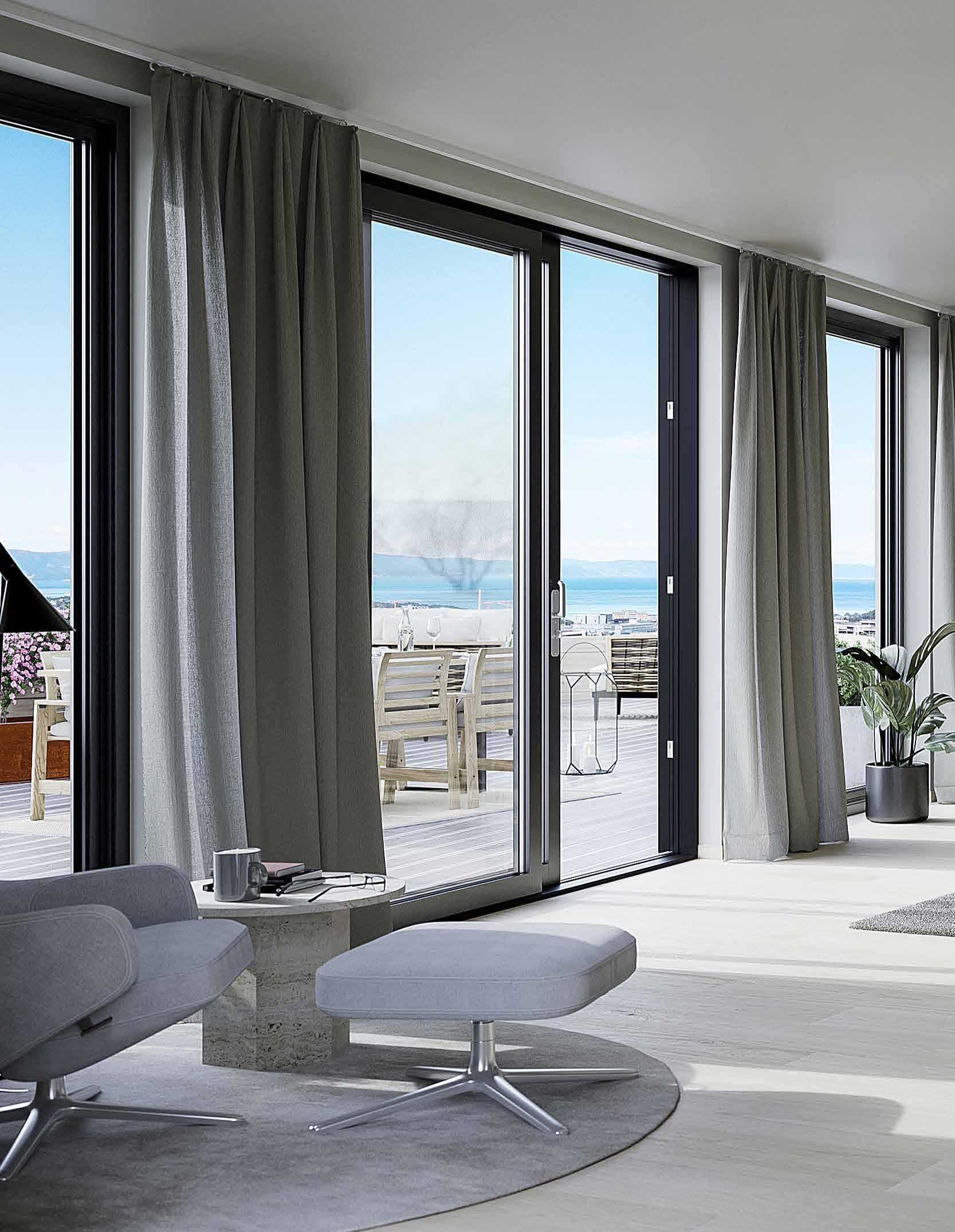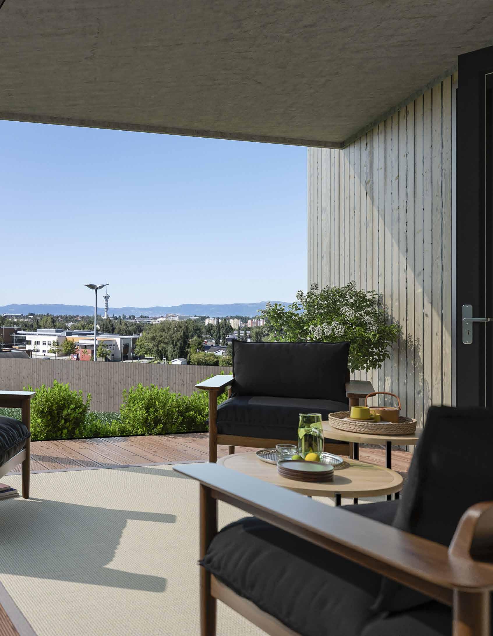 Også fra nederste etasje får du fantastisk utsikt! Dette er en visualisering fra leilighet H0001