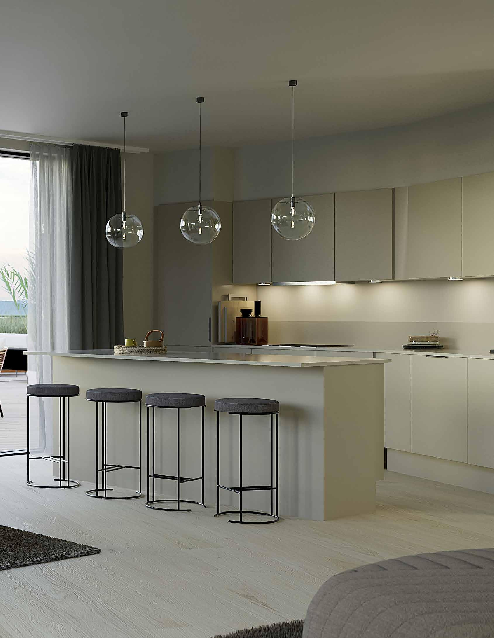 Med integrerte hvitevarer fra Siemens og ventilator fra Røroshetta. Det innovative danske designet gir et moderne preg, og du kan velge blant flere farger for å tilpasse kjøkkenet etter din stil.