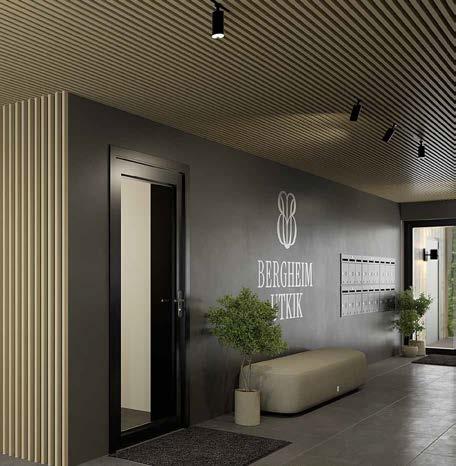 Byggets inngangparti blir et stilfullt førsteinntrykk. Spilevegg- og himling gir et moderne og eksklusivt uttrykk, samtidig som det bidrar til bedre akustikk.