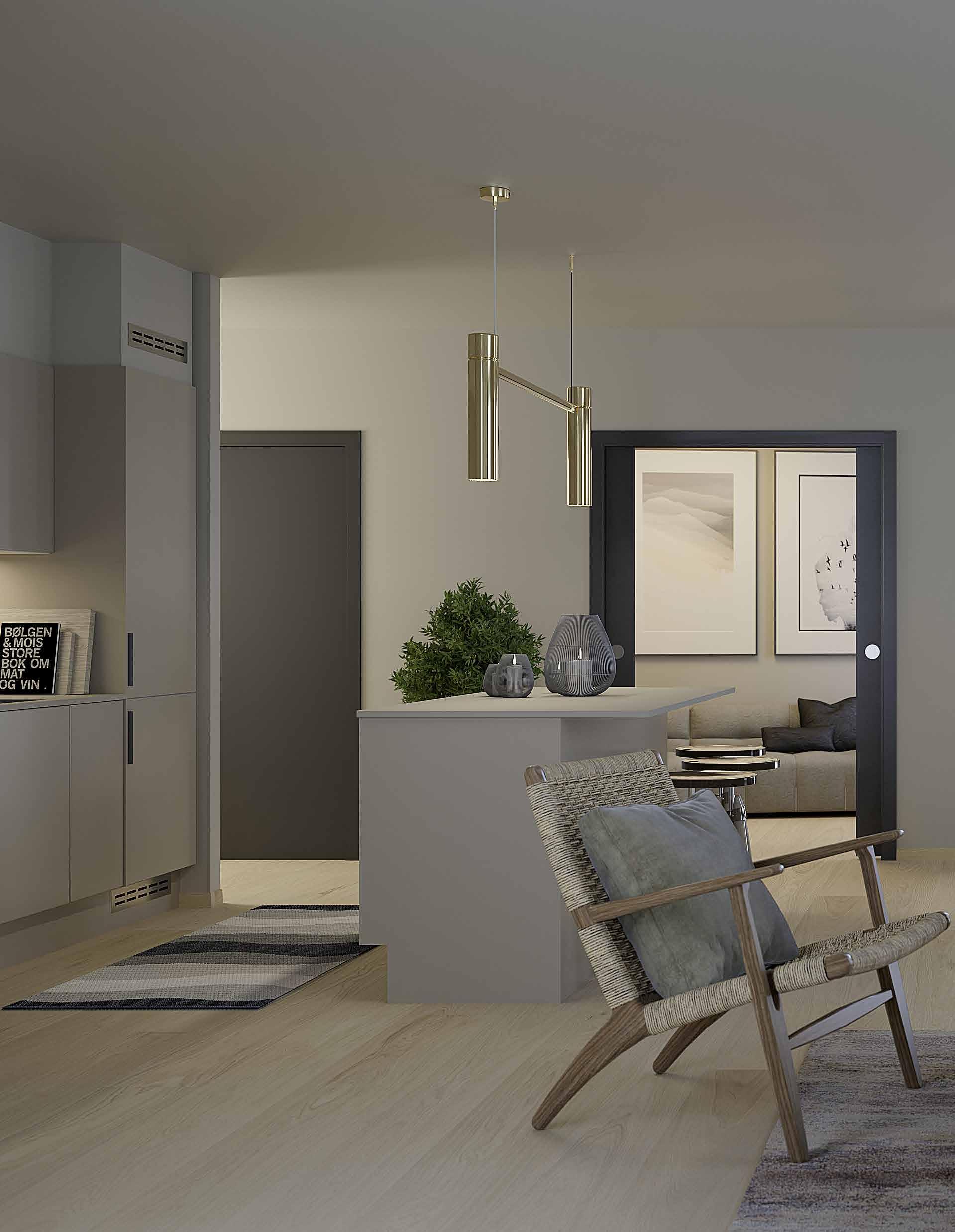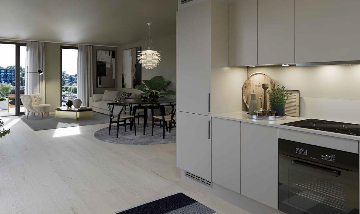 Kanskje du drømmer om et vinskap eller en kjøkkenøy? Det er også mulig å skifte farge på veggene, fliser på badet eller parkett i oppholdsrommene. Som kjøper hos oss har du mange valgmuligheter – hvis du vil!