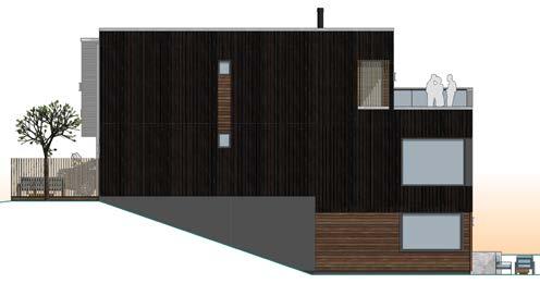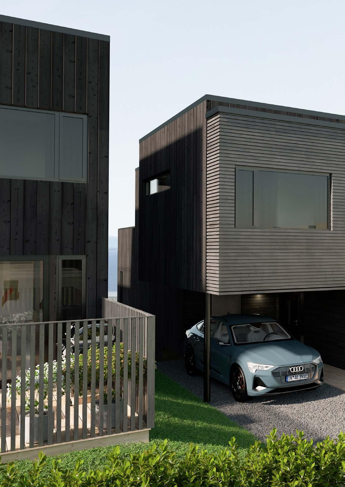 Spennende og variert fasade med bruk av både lektekledning og spiler. Vi har valgt mørke vinduskarmer som tilfører det lille ekstra.