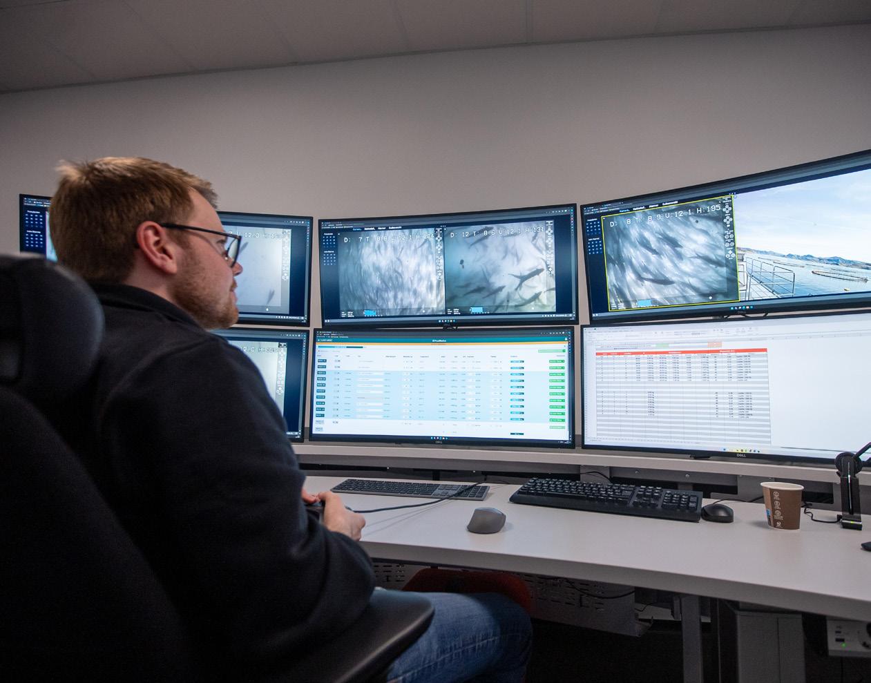 Jeg sitter med en drøss skjermer og fôrer to lokaliteter på Smøla. Her følger jeg med appetitten til fisken og justerer utforingen etter hva jeg ser. Her følger vi med på adferd, aktivitet, miljøet i sjøen og loggfører alle måltid og miljødata i samarbeid med lokalitet.