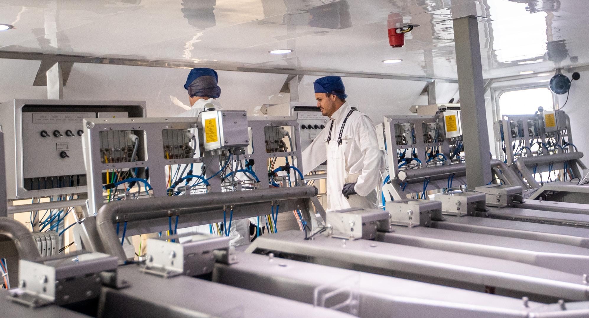 Med godt sjømannskap og verdens mest avanserte prosessfartøy sørger vi for optimal fiskevelferd og biosikkerhet gjennom bløggingen ved merdkanten og den nedkjølte sjøreisen til land. På den måten sikrer vi at fisken holder høyeste kvalitet både ved ankomst til fabrikken og til Mowi sine kunder.