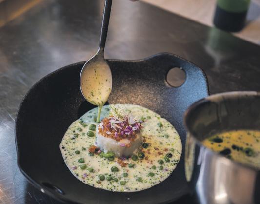 Hos Svang kan en typisk rett være dagens fangst, grillet spisskål, kremet saus laga på ristet fiskebein, purreolje og surdeigstempura.