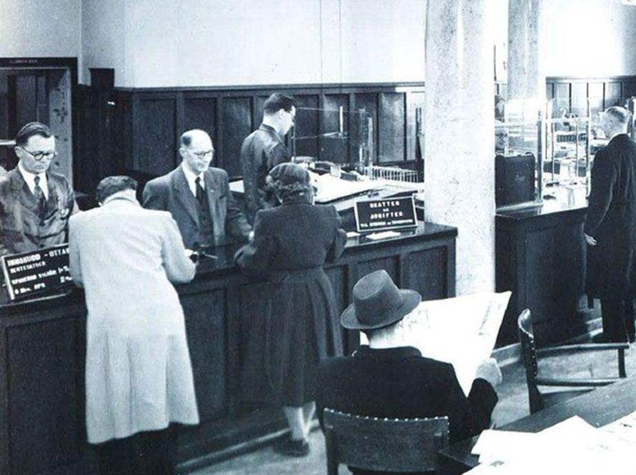 Bilde av banksalen i 1956. Mange kunder ønsket å forholde seg til en fast funksjonær.