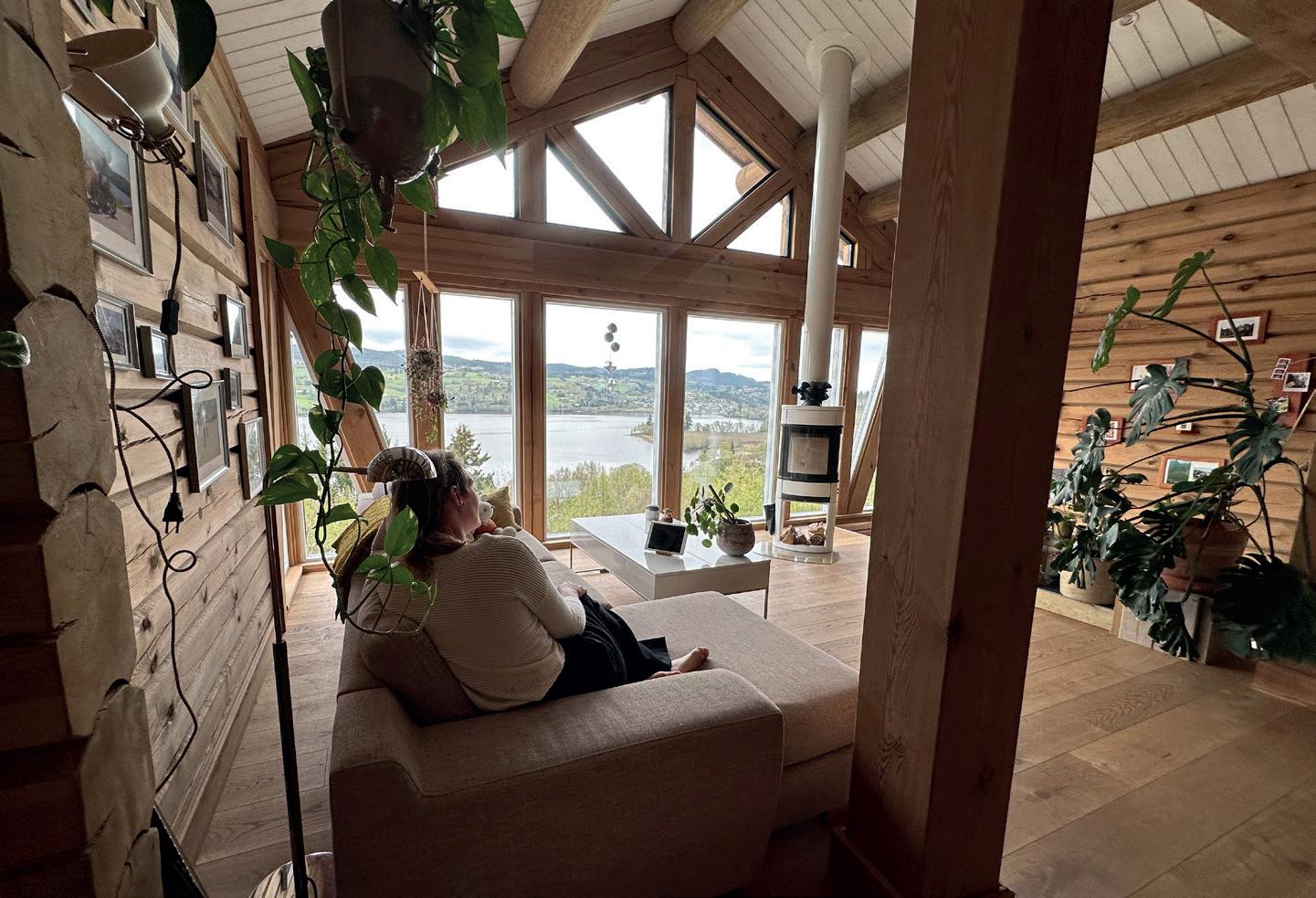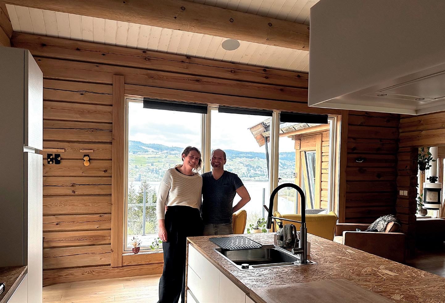 Tømmerhuset er på totalt 280 kvadratmeter, inkludert garasje. Det første spadetaket ble tatt i 2018, og de hadde hjelp til betongarbeidet, før huset kom som byggesett og ble satt sammen på åtte uker. – Vi bodde i hytta den siste tida av byggeprosessen. Men vi hadde utedo og badebalje, og måtte dusje på jobb, forteller Famke.