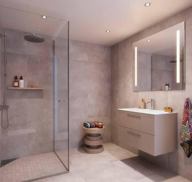 Kjøkkenet er selve hjertet i leiligheten med smarte løsninger, rene linjer og hvitevarer fra Miele. Store vindusflater slipper dagslyset inn og forsterker romfølelsen, mens ekstra takhøyde og luftige planløsninger gir en åpen og eksklusiv atmosfære. Det valgte konseptet fortsetter som en rød tråd gjennom leiligheten, med nøye avstemte veggfarger, fliser og baderomsinnredning som skaper en harmonisk helhet.