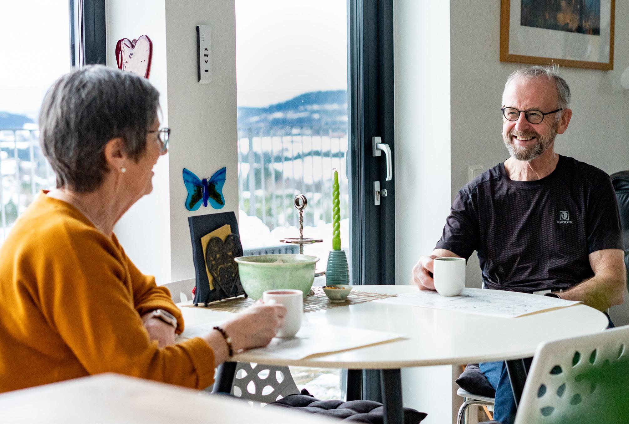 Overgangen fra enebolig til leilighet har vært behagelig for det aktive ekteparet. Etter hvert som barn og barnebarn vokste seg store, minsket behovet for å ha et stort hus og en stor hage som krevde sitt. Med parkeringskjeller, balkong, kontor, gjesterom og åpen kjøkkenløsning har de nå fått det de ønsket seg i en leilighet.