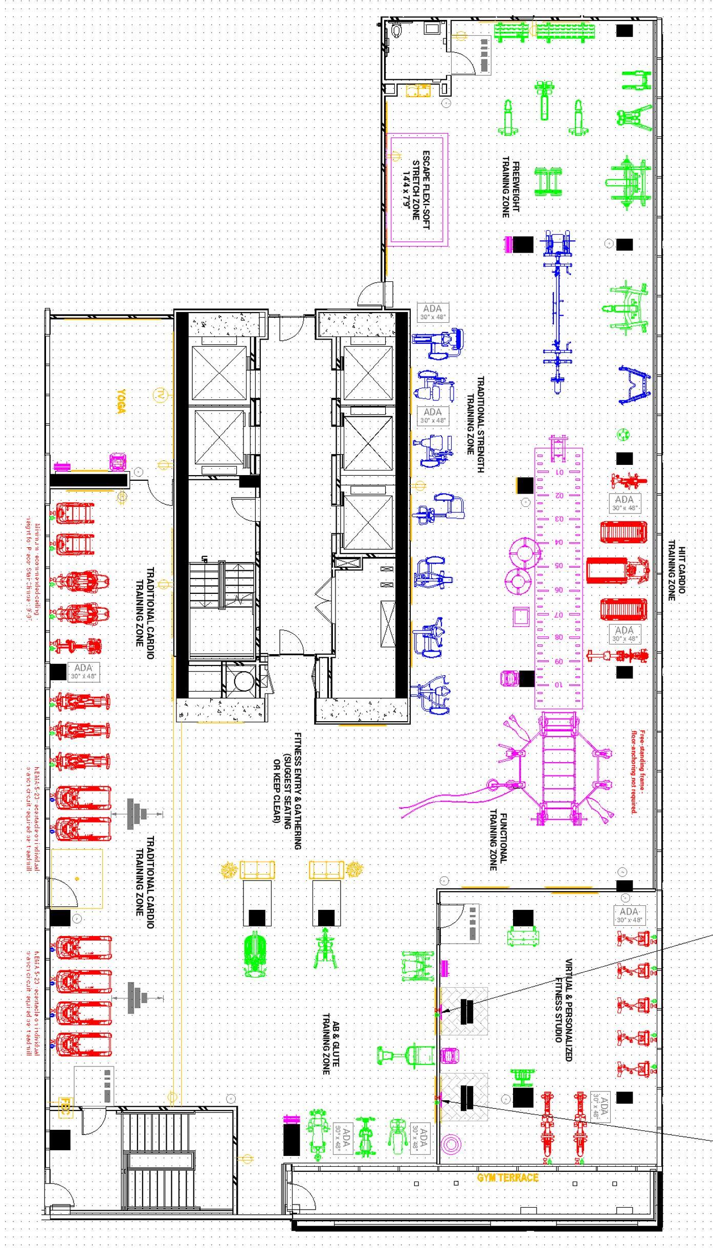 • Visualize workout zones through color coding and inlaid signage to clearly define workout areas.