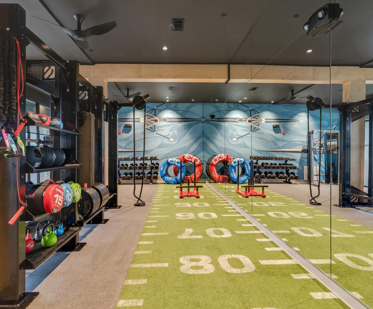Visibility and safety were prioritized through high-traction flooring, turf, optimized lighting, and mirrored walls.