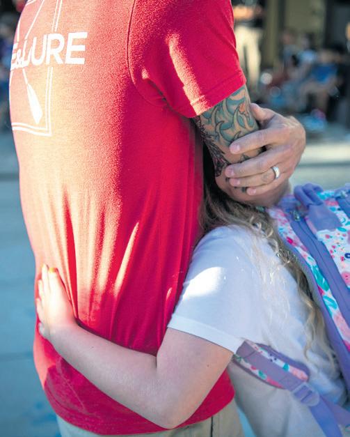 A parent hugs their daughter before walking her to a classroom at Ramstein Intermediate School at Ramstein Air Base, Aug. 21. Parents and guardians walk children to their classrooms to send them off on backto-school day 2023.