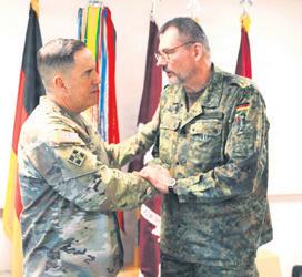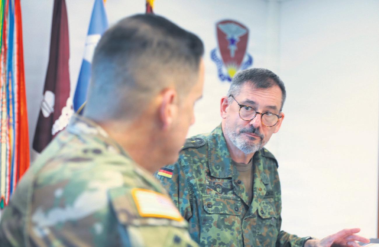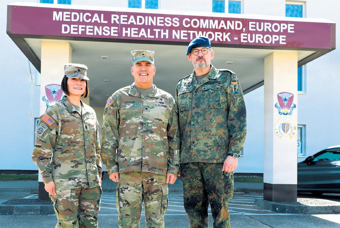 U.S. Army Brig. Gen. Roger Giraud, commander of Medical Readiness Command, Europe, and command surgeon for U.S. Army Europe and Africa, hosted a meeting with Maj. Gen. (Dr.) Johannes Backus, Bundeswehr Surgeon General and commander of the Bundeswehr Medical Support Command, at the Medical Readiness Command, Europe Headquarters April 9. Among the topics covered during their meeting, the senior medical leaders discussed the structures and roles of U.S. military medical assets within the U.S. Army Europe and Africa area of operations. Maj. Gen. Backus also provided an update on the Bundeswehr’s innovative patient flow hub and cluster concept. The highly successful meeting concluded with a focus on future partnership opportunities, including bilateral operational planning teams to address complex medical problem sets encountered in large-scale combat operations.