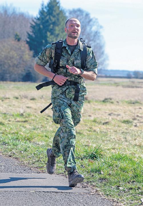 German Armed Forces Proficiency Badge competition participants take part in a 12-kilometer ruck at Ramstein Air Base, March 20. The GAFPB is earned by completing a 100-meter swim in uniform, pistol shooting requirements, a physical training test, a first aid test and a ruck.