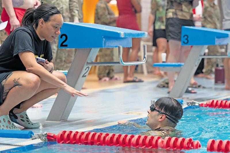 U.S. Army Sgt. 1st Class Milana Clark, German Armed Forces Proficiency Badge event volunteer, tells Senior Airman Isaiah Martinez, GAFPB participant, the time of their 100-meter swim after completing the swim during the German American Friendship Week at Ramstein Air Base, March 17. The GAFPB event fosters teamwork relationship building between participants from various services.