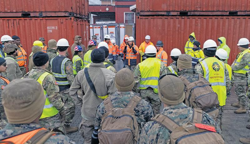 (Right) U.S. Army Maj. Michelle Su, an operations officer assigned to the 839th Transportation Battalion, Military Surface Deployment and Distribution Command, briefs military members from the U.S. Army, U.S. Navy, U.S. Marine Corps, and civilians, prior to the reception, staging, and onward movement operation for incoming units in Narvik, Norway, April 28. The incoming units are part of Operation Swift Response 25. SR25 involves approximately 4,100 U.S. participants and support from all Joint components including U.S. Air Forces Europe and Africa, Marine Forces Europe and Africa, Navy Forces Europe and Africa, U.S.-based special forces and 1,900 personnel from 14 other countries to include Finland, France, Germany, Hungary, Italy, Latvia, Lithuania, the Netherlands, Norway, Poland, Slovenia, Spain, Sweden, and the United Kingdom.