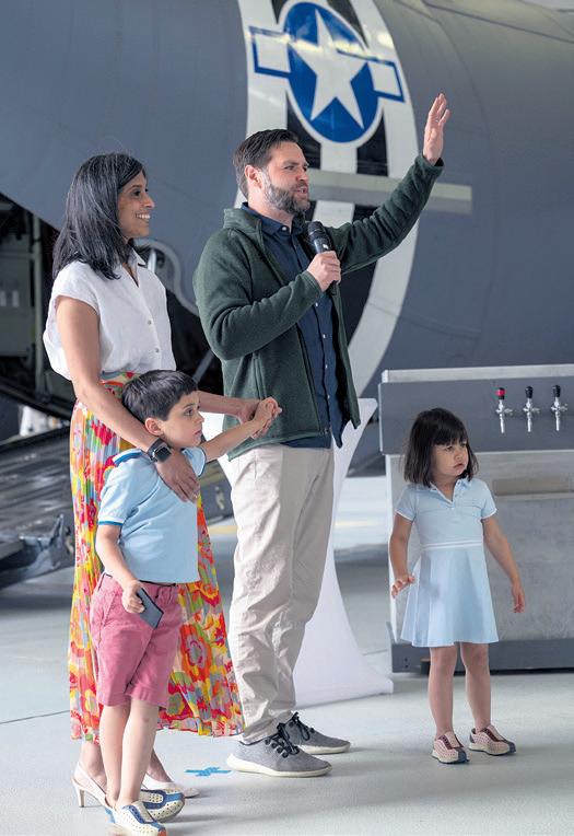 Vance poses with U.S. Airmen for a group photo during a visit at Ramstein Air Base, April 24. During his first visit to Ramstein AB since taking office earlier this year, Vice President Vance and his family held a toast to the troops event with U.S. Air Force and Army service members from the Kaiserslautern Military Community.