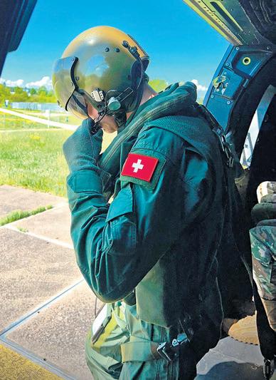 A crew chief on a Swiss Army Super Puma helicopter prepares for landing during a recent key leader engagement held near Bern, Switzerland.