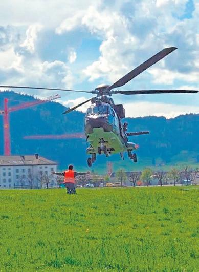 A Swiss Army Super Puma helicopter prepares to land during a recent key leader engagement between U.S. and Swiss Army medical leaders near Bern, Switzerland.