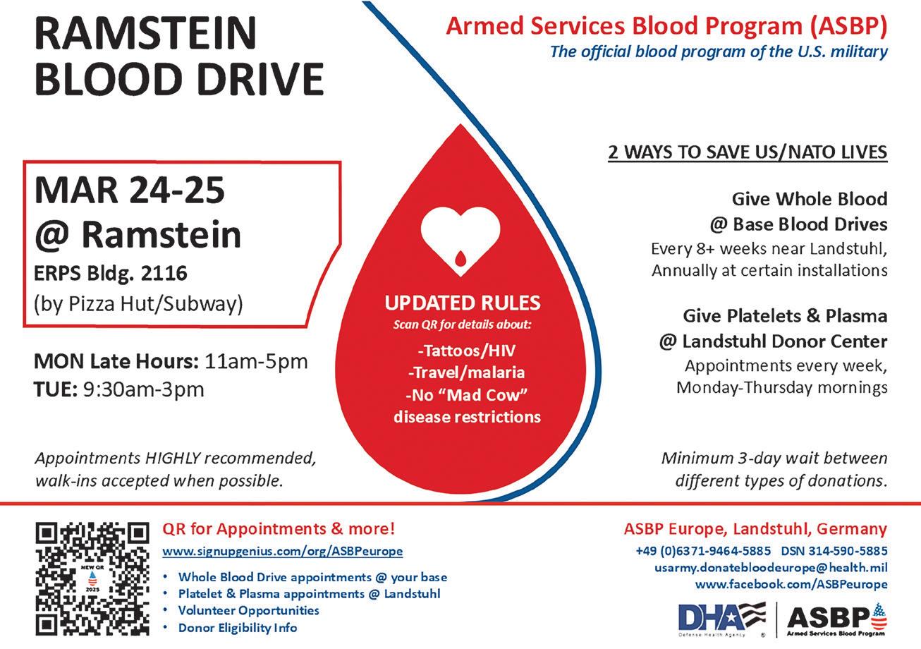 For inquiries or to request an in-person appointment, families can reach out via email at usaf. ramstein.86-mdg.mbx.efmpm@ health.mil or call DSN 4792375 / Civ 06371-46-2375. More information can be found on the EFMP Website: https://www. ramstein.af.mil/Medical/EFMP/