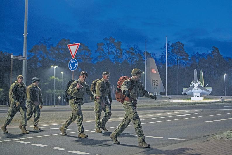 (Left) U.S. service members participate in the Norwegian Foot March at Ramstein Air Base, March 1. The foot march, also known as Marsimerket, rewards participants with a Norwegian Armed Forces skill badge that is earned for successful completion of the ruck march in the allotted time.