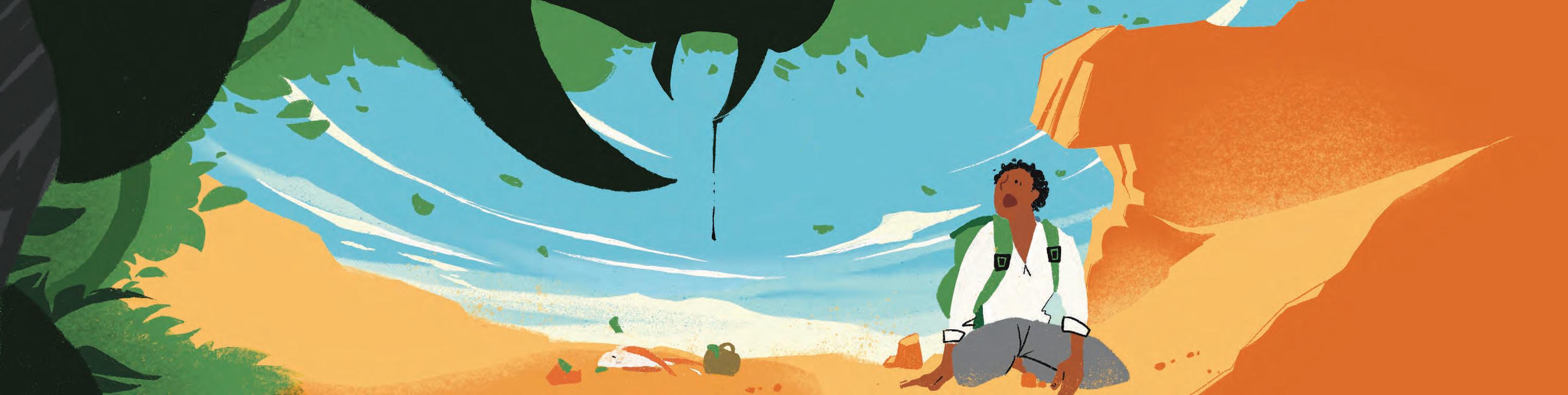 Mjomba Mzee alikuwa msimulia hadithi mahiri, punde si punde mawazo ya kila mmoja yalikuwa yameanza kuhama kutoka kwake yeye, nyota, moto, na hata hewa baridi ya usiku. Badala yake walijikuta wakijikongoja kupitia mchanga wa moto wa jangwani katika safari hii ambayo Mjomba Mzee alikuwa akiwasimulia kwa maelezo bayana. Msafiri alikuwa ameondoka mapema, lakini joto lilikuwa limepanda sana. Yapata adhuhuri alijua kuwa tayari alikuwa matatani. Yawezekana kabisa kuna mahali alisahau njia na sasa alikuwa amepotea. Amepotea katika jangwa linalowaka moto. Alipojaribu kuchukua tena kitu cha kunywa, aligundua kwamba maji yake yalikuwa yameisha, pia! Lo! Afanye nini sasa? Akakagua chupa zote kwa umakini, lakini zote zilikuwa tupu. Akatikisa chupa ili kupata tone la mwisho na kisha akaendelea kutembea. Aliendelea kujikongoja maili hata maili, akiwa hajui hasa anakokwenda, ila akijua kuwa ilimpasa kuendelea na mwendo au kufa kwa hakika. Mara akasimama. Hicho kilikuwa nini? Akafuta macho yake ili kuwa na uhakika kuwa haoni maruerue. Kwa mbali kulikuwa na mti, mti halisi. Huku akipumua kwa taabu, msafiri akaenda kasi kwa kadiri mwili wake uliokaukiwa maji ulivyomudu kwenda. Hatimaye, alipodhani asingeweza kupiga hatua nyingine aliufikia mti na kuanguka chini kwa kuishiwa nguvu chini ya uvuli wake. Sasa, kama ni wa kufa, angalau angefia kivulini! Kisha, alipokuwa amelala pale, akasikia kitu fulani. Drip. Drip. Drip. Kilisikika kama maji! Aliinuka na kuketi sawasawa kisha akaangalia pande zote kwa shauku. Na, kwa hakika, kulikuwa na matone ya maji yakidondoka kutoka mtini kwenda mchangani.