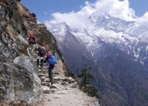There is still much to see and enjoy on the trek out. We pass through the famous Tengboche Monastery (the town is also the location of a famous bakery!) on the way to Namche Bazaar. The thicker oxygenenriched air makes for easy travel with time to stop to enjoy the views or chat to the locals. There’s also the opportunity to enjoy Namche Bazaar, where you can shop around for some of the thousands of items on display, such as the Tibetan rugs, jewellery and gemstones. Some people prefer to sample the offerings at the Irish bar and even enjoy a few rounds of pool. The next day, it’s onwards to Lukla for our final night in the Khumbu, before our flight back to Kathmandu.