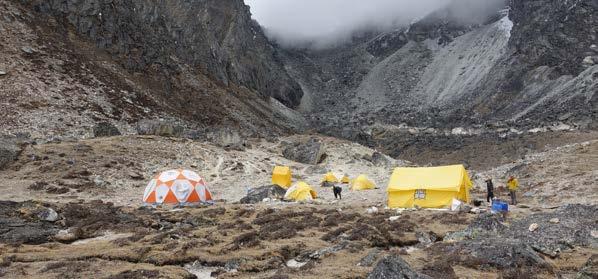 Eventually we leave the lodges of the Khumbu behind us and establish our Lobuche Base Camp at the lofty elevation of 4,800m/15,750ft. Our Base Camp is in a beautiful sunny meadow below the mountain and we are supported here by our talented kitchen crew who cater for us and keep us well fed. We spend two days here acclimatising and partaking in some rope skills training.