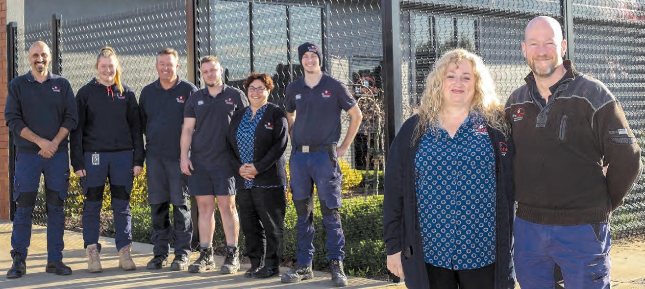 satisfaction. From right: Mark and Vicki Liversidge, third year apprentice Rohan, administration officer Rita, security technician Nathan, security technician Chris, first year apprentice Melanie and senior security technician Peter.