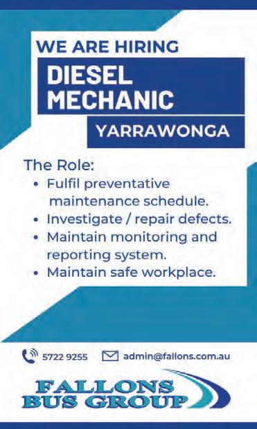 5832 8900 THE Foryour next advertising campaign phone 5832 8989 A member of The Victorian Country Press Association WATER CARTAGE JACOBSONS TRANSPORT BIGGER LOADS, BETTER VALUE 7 DAYS 7 DAYS Lot 1 & 2 Huggard Drive, Mooroopna 5825 3433 or 5825 2323 HR DRIVER Local GV Run 5 Days Full Time Contact Mark 0499 291 001 • • • • • • • echuca@novusautoglass.com.au (03) 5480 7554 WINDSCREEN FITTER REQUIRED Novus Glass in Echuca requires a Full Time Windscreen Fitter For more information or to place your employment advertisement, please phone 5832 8989 or email classifieds@sheppartonadviser.com.au C ove ring six newspaper to wns on average w eekly in one hit The Goulburn and Murray Valle ys’ lar g est cir culating newspaper A simple way for job seekers and employers to come together! WATER CARTAGE EMPLOYMENT CLASSIFIEDS T 03 58 32 8989 W www.sheppadviser.com .au If you’ve got the metal, we’ve got the cash It’s that simple! CASH FOR SCRA P ME TA L •C ash buye rs of al ferrous and non ferrous met als •F arm clean-ups •Old machiner y, car & truck bodies •B atteries Radiator s, Bras s & Cast Iron 13 5 Old Dook ie Rd, Sheppar ton 58 21 7876 ADVERTISERS PLEASE NOTE: Much hardship and difficulty is caused to job seekers by misleading advertising placed in the employment columns. Our Position Vacant/Situations Vacant columns are reserved for advertisements which carry a specific and genuine offer of employment. Ads for ‘Business Opportunities’, ‘Commission Only’ training courses and employment services should be submitted under those headings. Placing misleading ads is an offence against the fair trading legislation and all advertisements are subject to the publisher’s approval. REMOVAL The Adviser’s Editorial and Complaints policies are available on our website at: http://www.sheppadviser.com.au/ editorial-policy/ If you have any questions or would like to speak with someone about this, please email: editorial@sheppartonadviser.com.au Call our friendly team on (03) 5832 8900 or come and see us at 38-40 Welsford Street, Shepparton. Did you know? PUBLIC NOTICES • Lawns & Gardens • Gutter Cleaning • NDIS Provider • Work Cover Contact Ness 0483 827 529 GARDEN & LAWN MAINTENANCE GARDENING INSTANT CASH FOR YOUR UNWANTED GOODS • DeceasedEstates • Antiques • China • Lamps • Brickabrack • Anitique Cars LOCATED IN SHEPPARTON! Phone Roy 0424 68 8 74 4 Albu ry Antiques Shepparton 159 High StShepparton Open Wednesday to Sunday 10am to 4pm WANTED TO BUY Should you have any queries or concerns please contact (03) 5832 8989 PRIVACY The Adviser Newspaper (Simtru Pty Ltd) collects and documents information when clients place advertisements such as contact and billing details, this information may be used to inform you of special classified offers that may benefit you. All credit card details provided to The Adviser to assist with payment are not documented or filed, and are disposed of once payment and agreement on advertisements are confirmed. The Adviser reserves the right to alter or reject any advertisements that are deemed inappropriate or offensive to our readers, or if we are in doubt about its compliance with the law VEHICLE ADVERTISERS Private vendors of motor cars advertised for sale must include in their advertisement the cash price of vehicle and the registration number or engine number (if unregistered) ADVERTISING DEADLINES Display - 5pm Friday | Employment - 12pm Monday | Line Ads - 12pm Friday Prior to publication distribution date (every Wednesday) Special discounts available for multiple bookings. Phone 5832 8989 for details. CREDIT CARDS WE ACCEPT Payment required prior to publication deadlines. Accounts available to commercial clients. Cash, cheque, money orders or pay in person at 38-40 Welsford St, Shepparton.