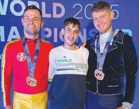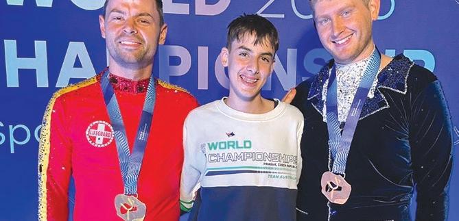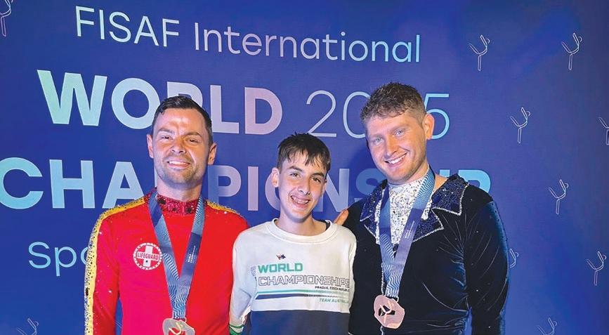 SPORTS AEROBICS... Three locals have represented Revival Aerobics Studio and Australia at the 2025 FISAF World Championships held in Prague, Czech Republic, with each bringing home a medal. RAS owners and coaches Sean Reynolds (left) won gold and Daniel Johnson (right) won bronze, competing in the Masters Male Individual Category. Brodie Kelly (centre) won gold in the Junior Male Individual Category. Photo: Supplied