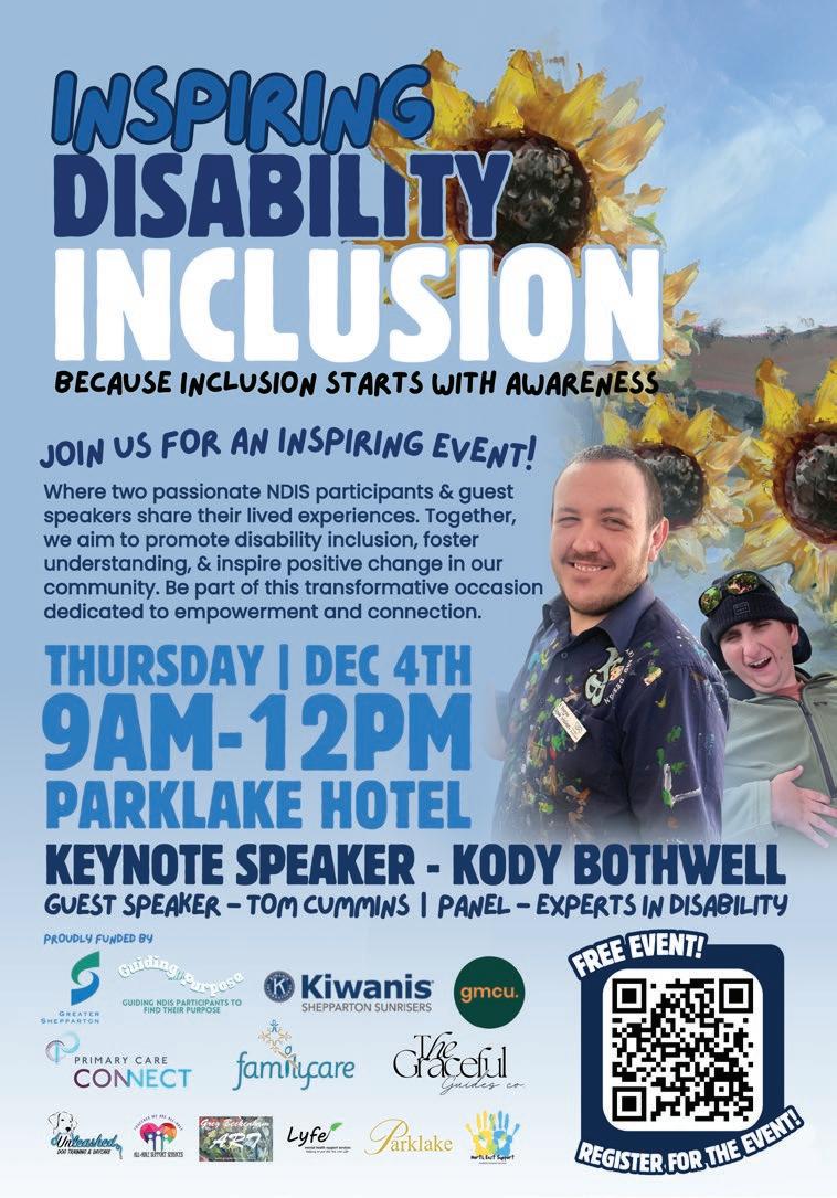 If you can’t make it to the Inspiring Disability Inclusion event, you can book Kody to do a talk at your business or organisation. With more information about booking him at The Inspiring Disability Inclusion event, supported by Guiding with Purpose, and will be held on Thursday, December 4 from 9am to 12pm at the Parklake, on Wyndham Street, Shepparton. It is a free event, but there are limited tickets available, so bookings are essential. Book at Eventbrite https://www.eventbrite.com.au/e/ inspiring-disability-inclusion-tickets-1902490613639.