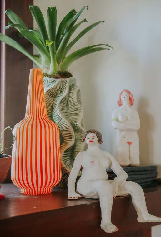 The two figurines (made by Gill’s landlord in the U.K.) sit atop the built-ins of the fireplace.