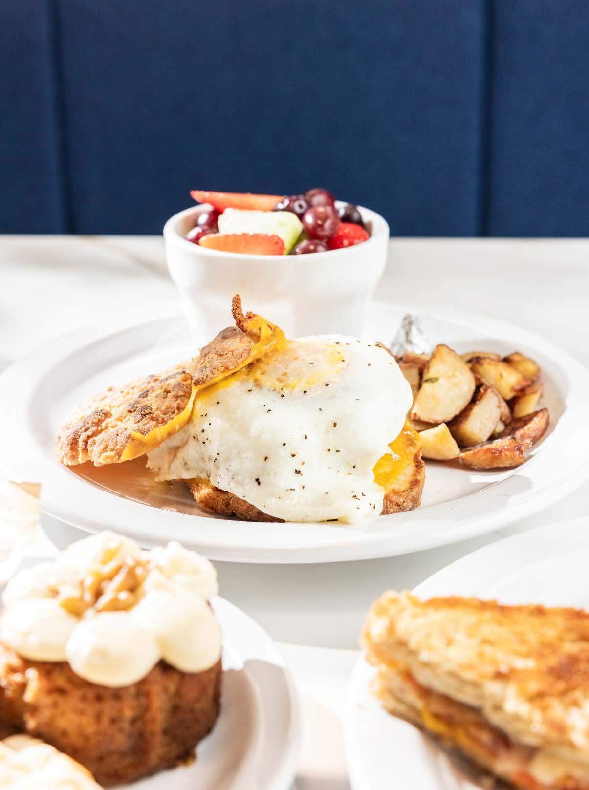 Hugs Cafe offers multiple breakfast options, including the biscuit sandwich ($12) — sausage, cheddar cheese and egg on a cheddar onion biscuit — that comes with breakfast potatoes and fruit.