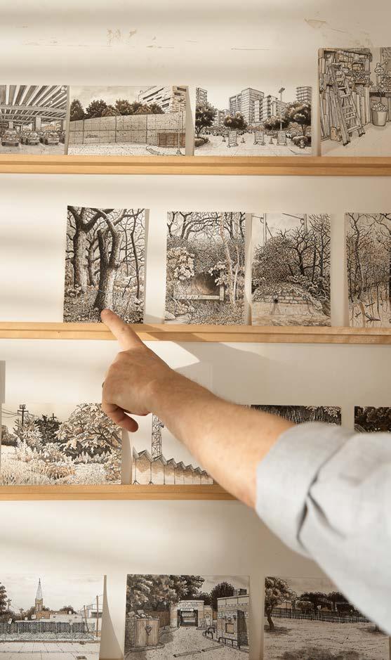 It also helps inspire Smith if he has a personal connection to the place he’s depicting, like if it’s somewhere he drives by all the time. If he is to sketch the location, he must also be able to find the address and visit to see if there’s anything there to be drawn.