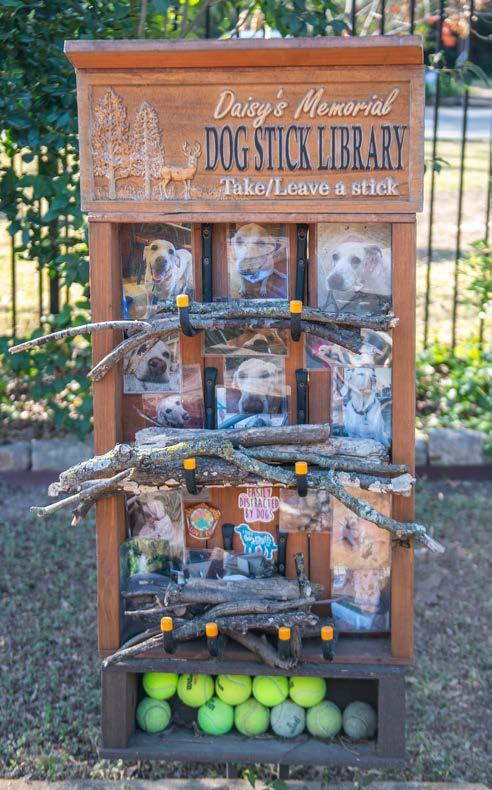 Down on Fisher Road, close to White Rock Lake, Mark Coleman and Kimberly Haley-Coleman make their home. In front of their place, near the street, stands Daisy’s Memorial Dog Stick Library, a tribute to Daisy, the family dog, who died in 2024. The structure, handmade by dad Mark and daughters Maggie and Haley, encourages dogs walking by to “take/leave a stick.” Think Little Free Library but with sticks and tennis balls.