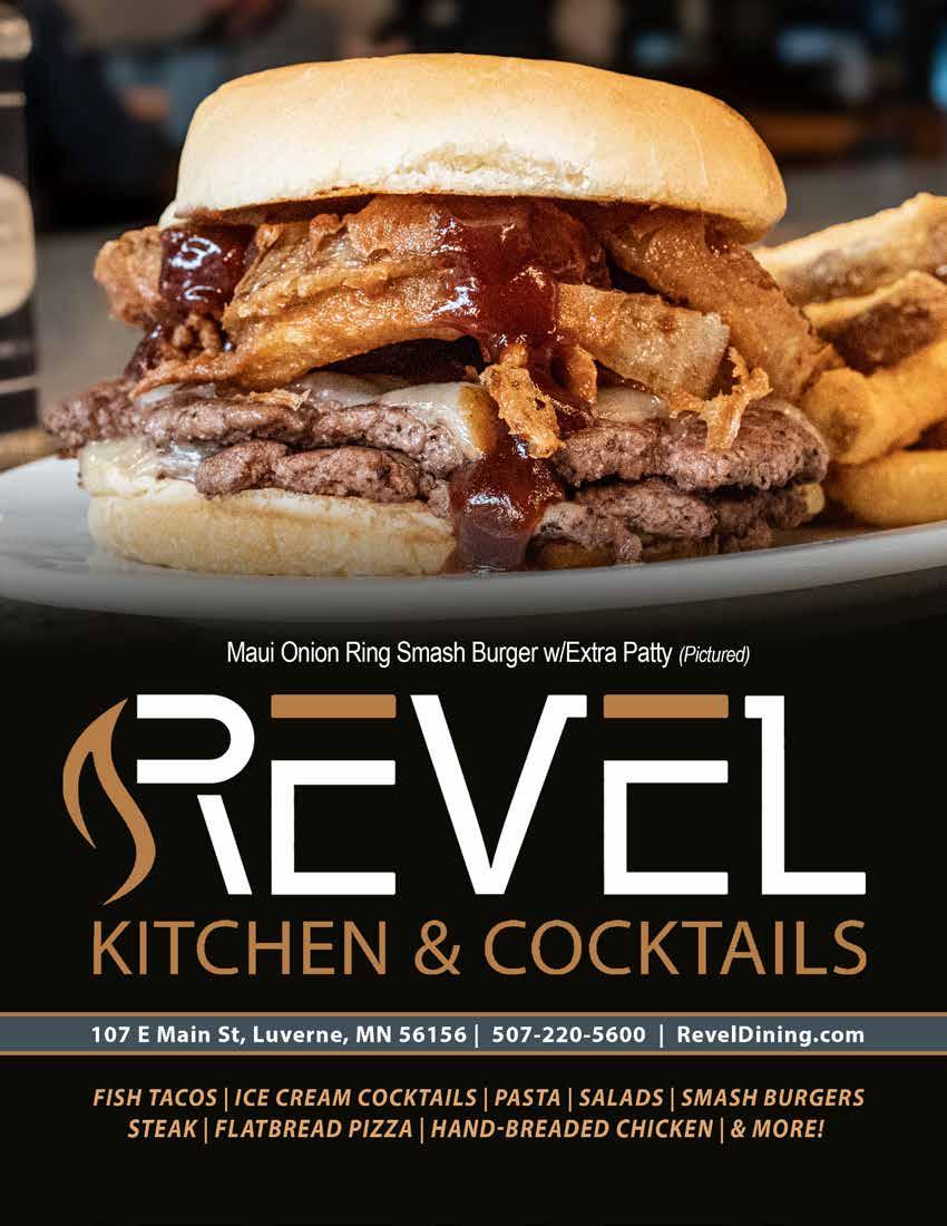 Revel Kitchen & Cocktails is a fun and new familyfriendly now open in Luverne, MN. You’ll enjoy Smash Burgers, HandBreaded Chicken, Bracco Fish Tacos, Steak, Pasta, Salads, Cocktails, and more!
