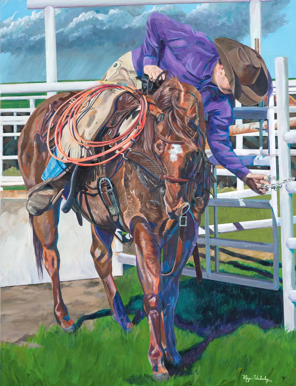 Wimberley also brings her experience in the western/ranch lifestyle to her art, exhibiting the hard work of ranchers and bringing awareness to the work women do in these spaces. She is the founder of Cowgirl Artists of America, which strives to increase opportunities and recognition for female artists and makers working in the Western genre through community, education, promotion, and collaboration. Wimberley’s work has been exhibited in the Mountain Oyster Show, Cowgirl Up! at Desert Caballeros Western Museum, The Cowgirl Gathering, and Women’s Work at the A.R. Mitchell Museum of Western Art, among others.