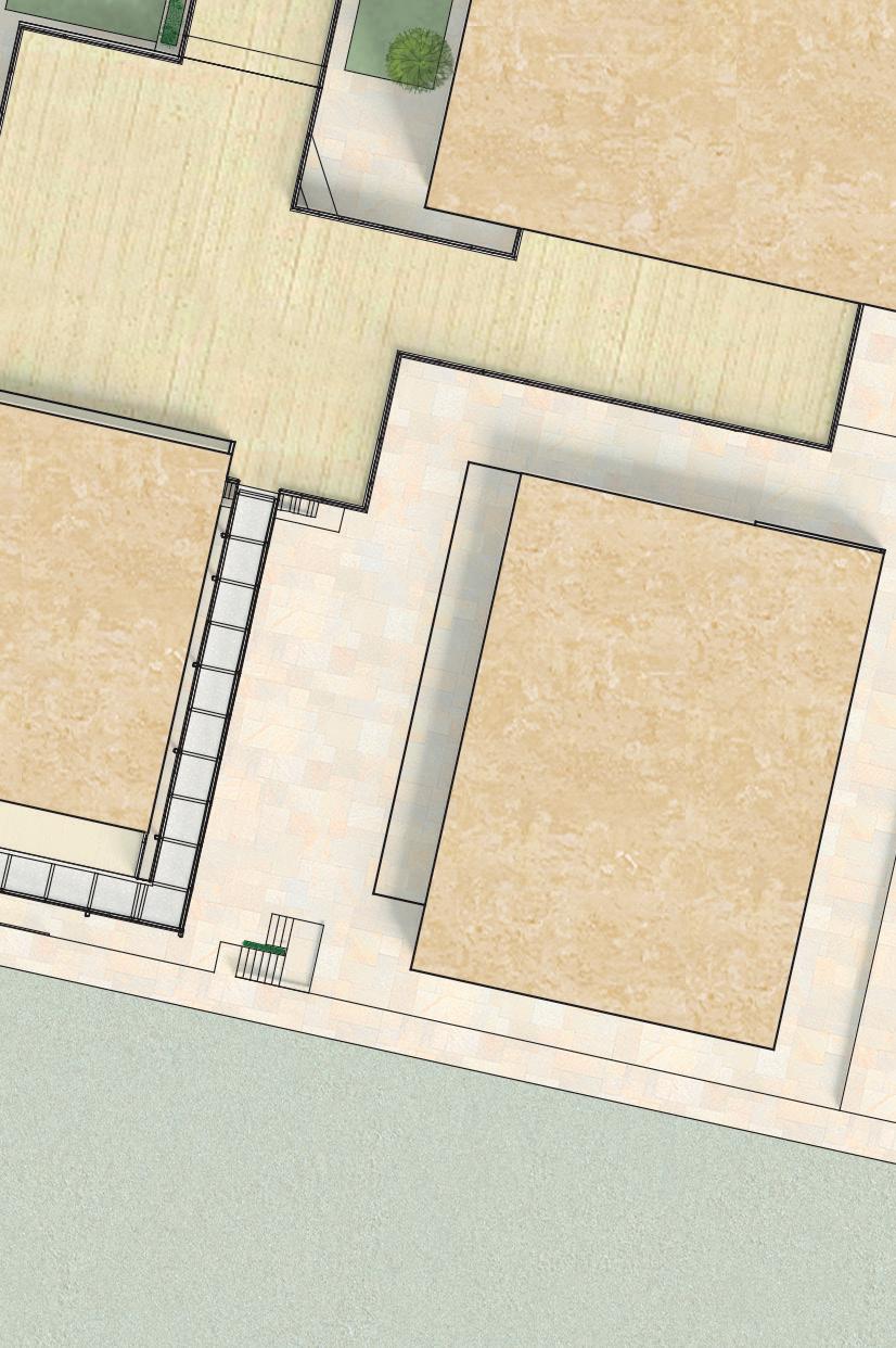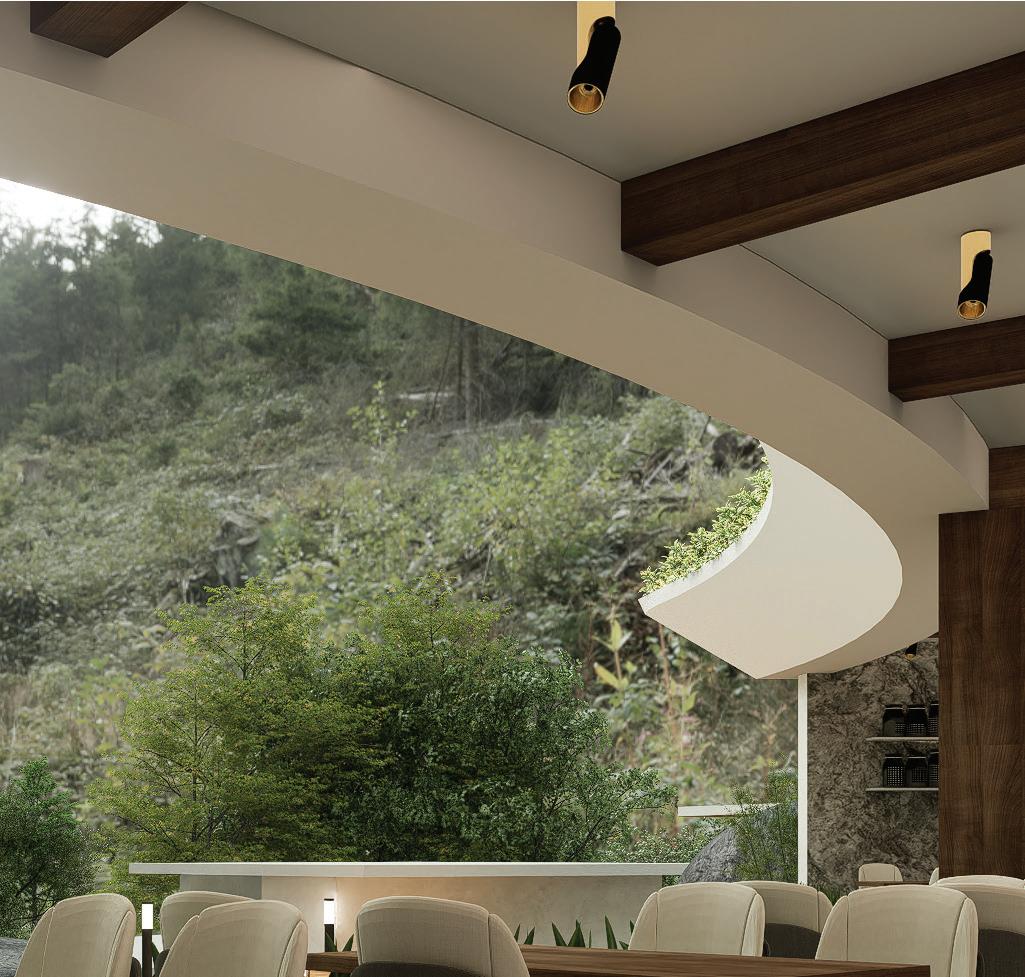 The site is zoned into public, semi-public, and private spaces to ensure a seamless flow of activities. Parking is situated on the lower level, while the second level houses the reception, restaurant, swimming pool, recreation areas, and associated amenities.